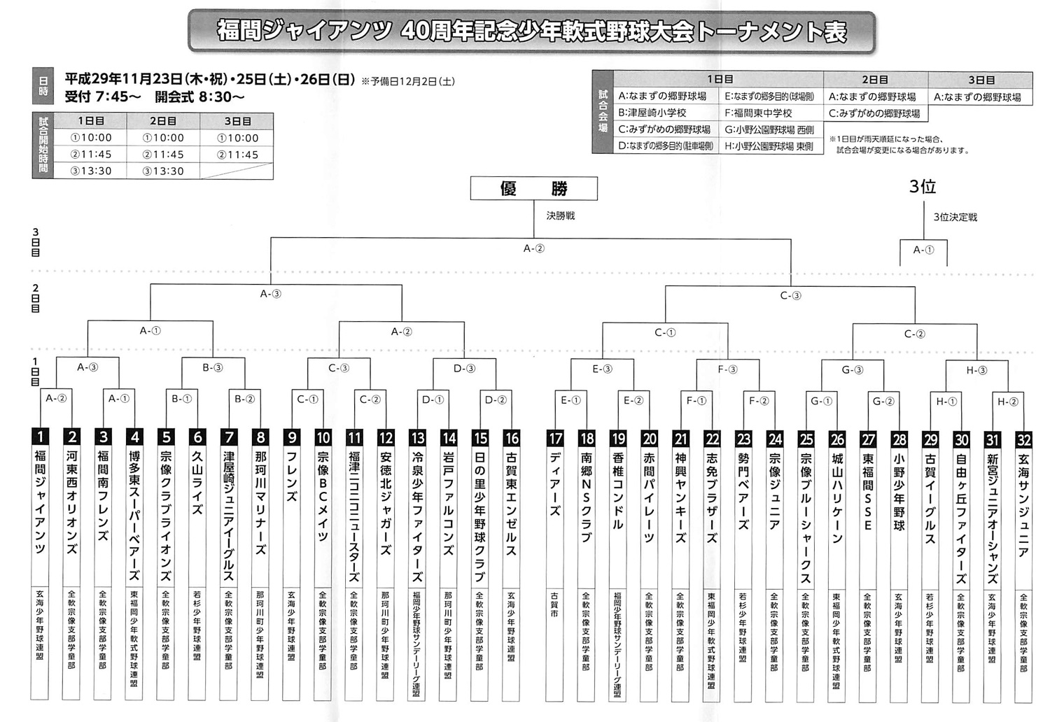 2017福間ジャイアンツ40周年記念大会の組み合わせ 2017 10/23 記事一覧 2017年10月23日 記事一覧 2017太宰府天満宮少年野球大会の組み合わせ 2017福岡市選抜学童新人交流野球大会の組み合わせ 関連記事 2025年グラウンド納め&ラストノック! 2025年12月24日 福岡銀行旗の結果! 2025年12月8日 ちびマッチ九州大会! 2025年12月3日 ちびマッチ九州大会直前 2025年11月28日 武蔵ヶ丘旗熊本遠征! 2025年11月26日 小野少年ちびっこ大会結果! 2025年11月10日 芦屋町長杯準優勝! 2025年11月6日 小野のちびっこ大会初日! 2025年10月29日